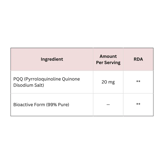PQQ Capsules feature Pyrroloquinoline Quinone (PQQ) Disodium Salt, delivering 20 mg per serving in a 99% pure bioactive form. PQQ is a powerful antioxidant known for supporting mitochondrial health, cellular energy production, and cognitive function.