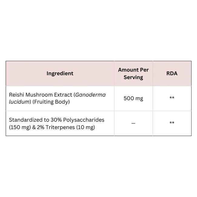 Reishi Mushroom Extract Capsules deliver potent Reishi Extract (Ganoderma lucidum) from the fruiting body, standardized to 30% Polysaccharides (150 mg) and 2% Triterpenes (10 mg). Reishi is a time-honored adaptogen, revered for promoting immune health, stress resilience, and overall vitality.
