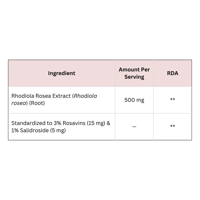 Rhodiola Rosea Extract Capsules contain premium Rhodiola rosea root extract, standardized to 3% Rosavins (15 mg) and 1% Salidroside (5 mg). Known as an adaptogen, Rhodiola supports energy, endurance, mental performance, and a healthy stress response.